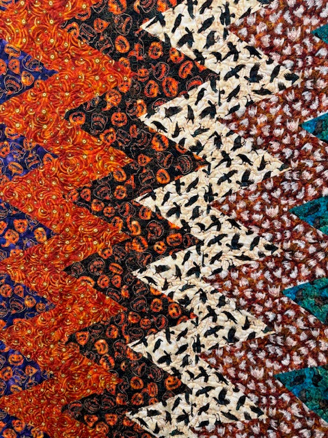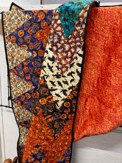 This bold Halloween quilt features a striking chevron design with ravens, pumpkins, swirling oranges, and rich fall colors. The back is finished with super-soft orange minky, making it warm, cozy, and perfect for seasonal snuggling or décor.