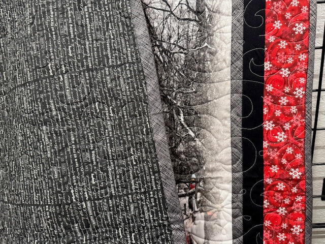 Celebrate the magic of the season with the Red Barn Christmas Quilt, a beautiful handmade holiday throw that captures the peaceful charm of winter on the farm. The front features a stunning Hoffman Fabrics digital panel showcasing a snowy red barn scene, framed with a festive metallic-accent border and rich red fabric dusted with delicate snowflake flurries.